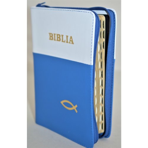 Biblie din piele, marime medie, culoare alb cu albastru, simbol peste, fermoar, index, margini aurii, cuv. lui Isus cu rosu [SB 057 PFI]
