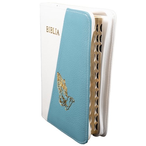 Biblie din piele, marime medie, culoare, alb cu turcoaz, simbol maini in rugaciune, fermoar, index, margini aurii, cuv. lui Isus cu rosu [SB 057 PFI]