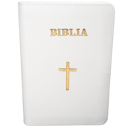 Biblie din piele, marime medie, culoare alb, simbol cruce, fermoar, index, margini aurii, cuv. lui Isus cu rosu [SB 057 PFI]