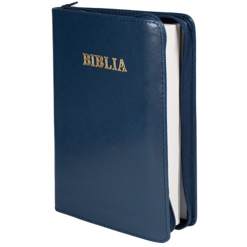 Biblie din piele, marime medie, culoare, albastru, fermoar, margini albe, cuv. lui Isus cu rosu [053]
