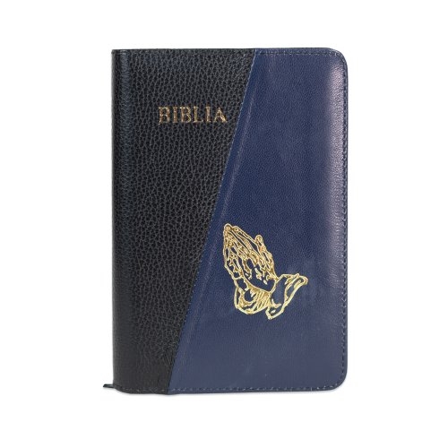 Biblie din piele, marime medie, culoare, negru cu albastru metal închis, simbol maini in rugaciune, fermoar, index, margini aurii, cuv. lui Isus cu rosu [SB 057 PFI]