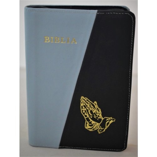 Biblie din piele, marime medie, culoare albastru metalic-negru, simbol maini in rugaciune, fermoar, index, margini aurii, cuv. lui Isus cu rosu [SB 057 PFI]