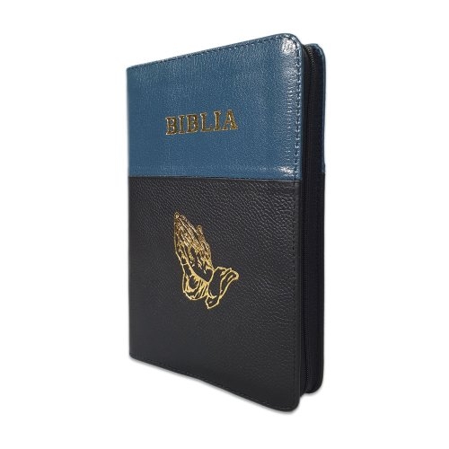 Biblie din piele, marime medie, culoare albastru mineral cu negru, fermoar, maini in rugaciune, margini albe,cuv. lui Isus cu rosu [053]