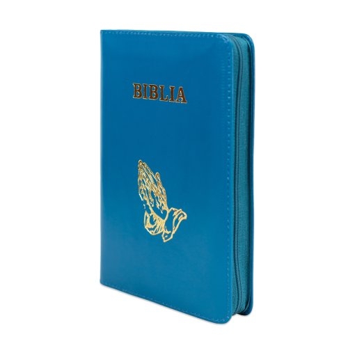 Biblie din piele, marime medie, culoare, albastru ocean, simbol maini in rugaciune, fermoar, index, margini aurii, cuv. lui Isus cu rosu [SB 057 PFI]