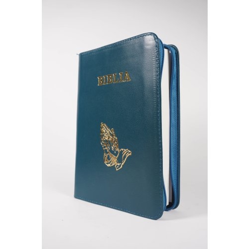 Biblie din piele, marime medie, culoare, albastru petrol, fermoar, margini albe, simbol maini in rugaciune, cuv. lui Isus cu rosu [053]