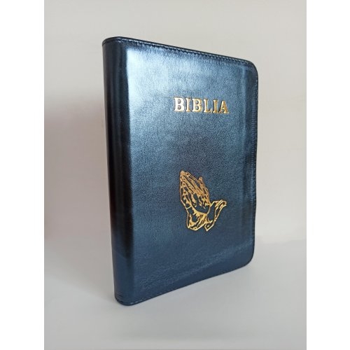 Biblie din piele, marime medie, culoare albastru sidefat, simbol maini in rugaciune, fermoar, index, margini aurii, cuv. lui Isus cu rosu [SB 057 PFI]