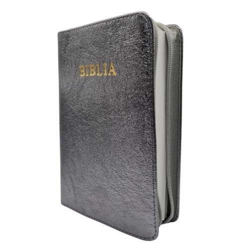 Biblie din piele, marime medie, culoare, argintiu sidefat, fermoar, margini albe, cuv. lui Isus cu rosu [053]