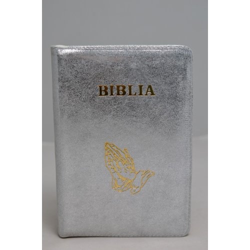Biblie din piele, marime medie, culoare argintiu, simbol maini in rugaciune, fermoar, index, margini aurii, [SB 057 PFI]
