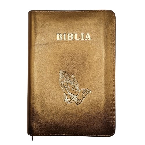 Biblie din piele, marime medie, culoare, auriu, fermoar, margini albe, simbol maini in rugaciune, cuv. lui Isus cu rosu [053]