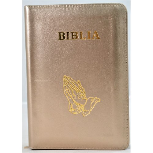 Biblie din piele, marime medie, culoare auriu sidefat, simbol maini in rugaciune, fermoar, index, margini aurii, [SB 057 PFI]