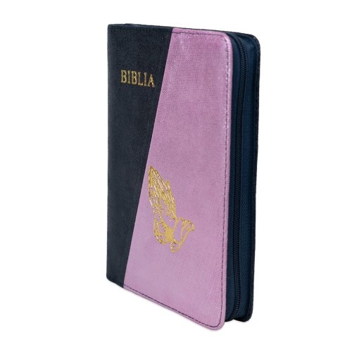 Biblie din piele, marime medie, culoare, bleumarin închis sidefat cu roz sidefat, simbol maini in rugaciune, fermoar, index, margini aurii, cuv. lui Isus cu rosu [SB 057 PFI]