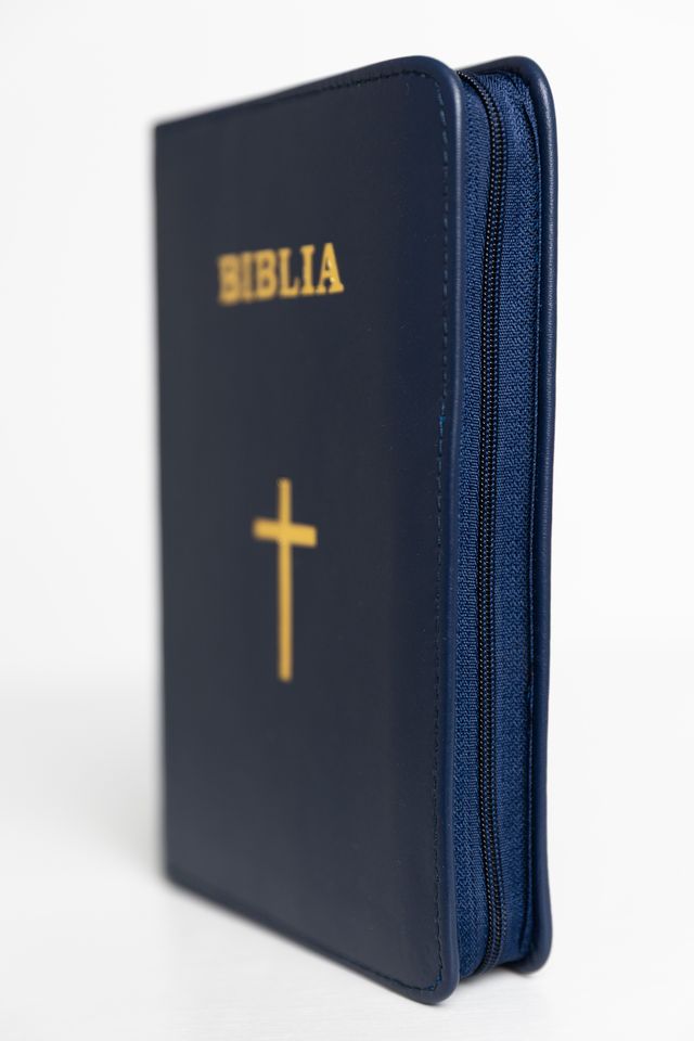 Biblie din piele, marime medie, culoare bleumarin, simbol cruce, fermoar, index, margini aurii [SB 057 PFI]