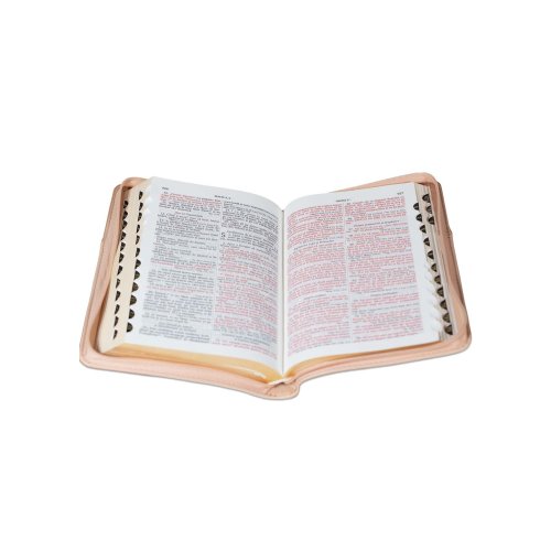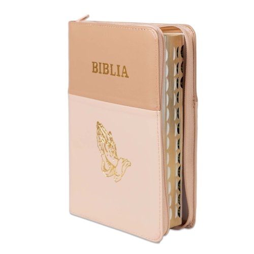 Biblie din piele, marime medie, culoare cappuccino cu crem, simbol maini in rugaciune, fermoar, index, margini aurii, cuv. lui Isus cu rosu [SB 057 PFI]