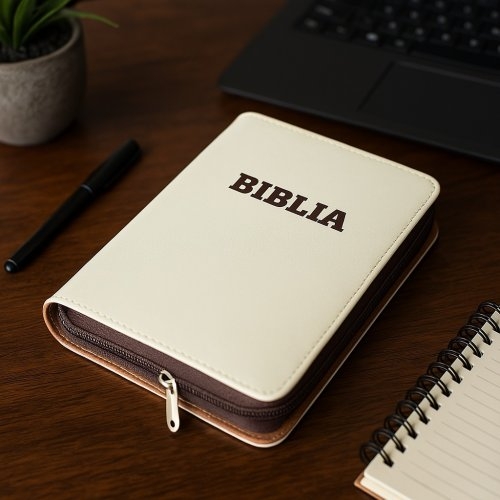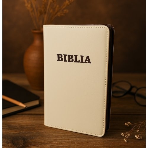 Biblie din piele, marime medie, culoare crem cu maro, fermoar, index, margini aurii, cuv. lui Isus cu rosu [SB 057 PFI]