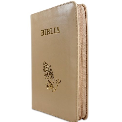 Biblie din piele, marime medie, culoare crem, simbol maini in rugaciune, fermoar, index, margini aurii, cuv. lui Isus cu rosu [SB 057 PFI]
