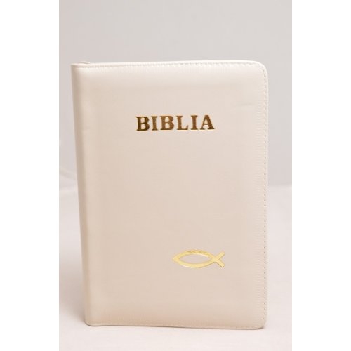 Biblie din piele, marime medie, culoare crem, simbol peste, fermoar, index, margini aurii, cuv. lui Isus cu rosu [SB 057 PFI]