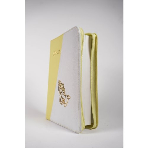 Biblie din piele, marime medie, culoare, galben cu alb, fermoar, margini albe, simbol maini in rugaciune, cuv. lui Isus cu rosu [053]