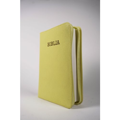 Biblie din piele, marime medie, culoare, galben, fermoar, margini albe, cuv. lui Isus cu rosu [053]