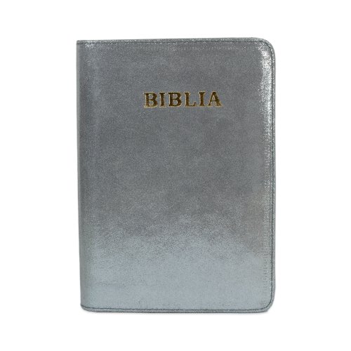 Biblie din piele, marime medie, culoare, gri sidefat, fermoar, index, margini aurii, cuv. lui Isus cu rosu [SB 057 PFI]