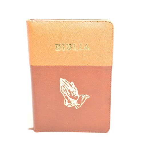 Biblie din piele, marime medie, culoare maro cu maro inchis, simbol maini in rugaciune, fermoar, index, margini aurii, [SB 057 PFI]