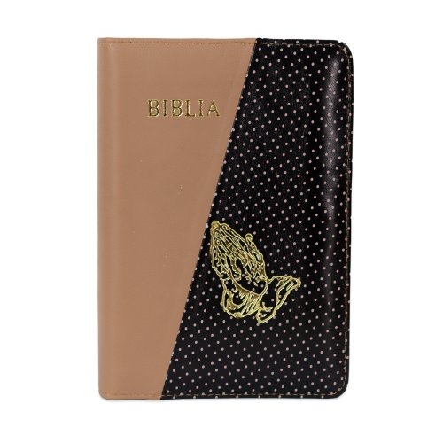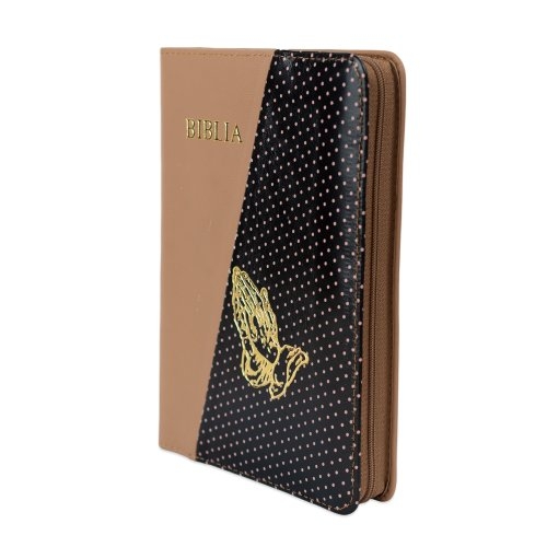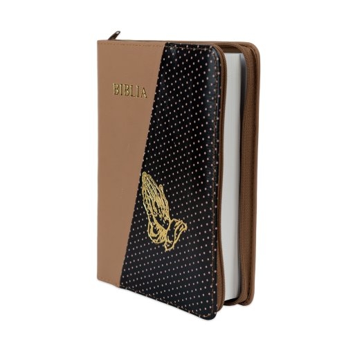 Biblie din piele, marime medie, culoare, maro cu negru și puncte roz, fermoar, margini albe, simbol maini in rugaciune, cuv. lui Isus cu rosu [053]