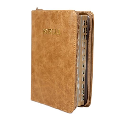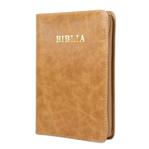 Biblie din piele, marime medie, culoare maro deschis, fermoar, index, margini aurii, cuv. lui Isus cu rosu [SB 057 PFI]