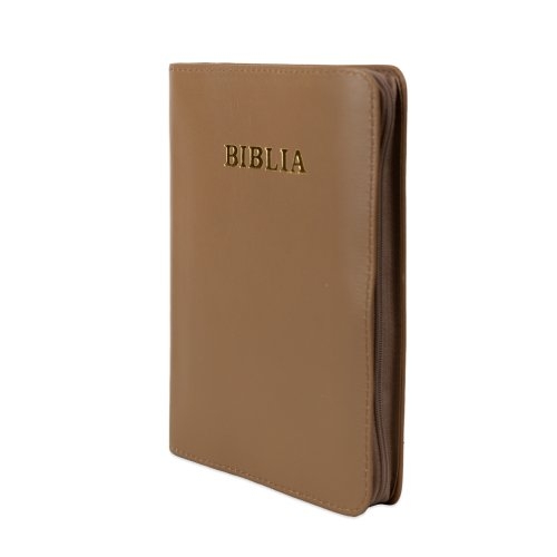 Biblie din piele, marime medie, culoare maro deschis, fermoar, margini albe,cuv. lui Isus cu rosu [053]