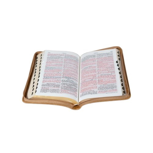 Biblie din piele, marime medie, culoare maro deschis, simbol maini in rugaciune, fermoar, index, margini aurii, cuv. lui Isus cu rosu [SB 057 PFI]