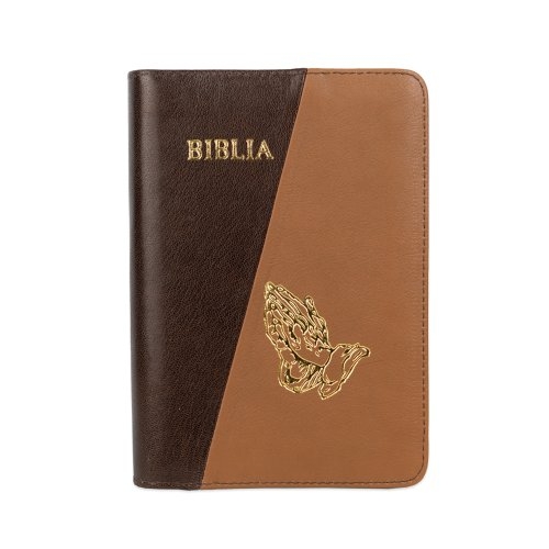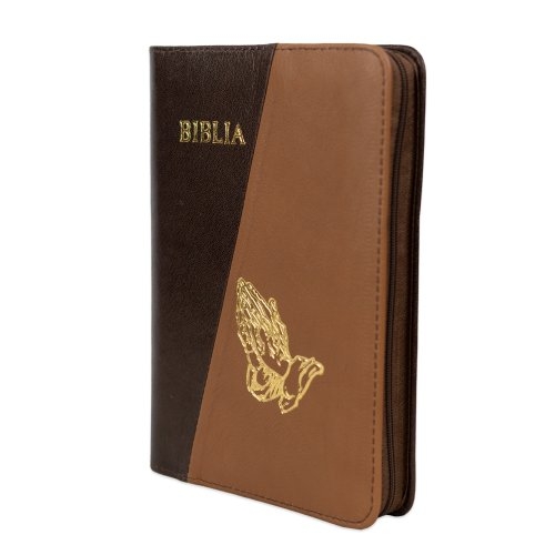 Biblie din piele, marime medie, culoare, maro închis cu maro, simbol maini in rugaciune, fermoar, index, margini aurii, cuv. lui Isus cu rosu [SB 057 PFI]