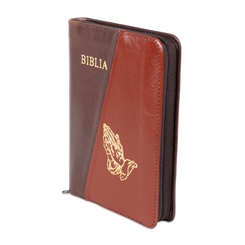 Biblie din piele, marime medie, culoare maro inchis cu maro, simbol maini in rugaciune, fermoar, index, margini aurii, cuv. lui Isus cu rosu [SB 057 PFI]