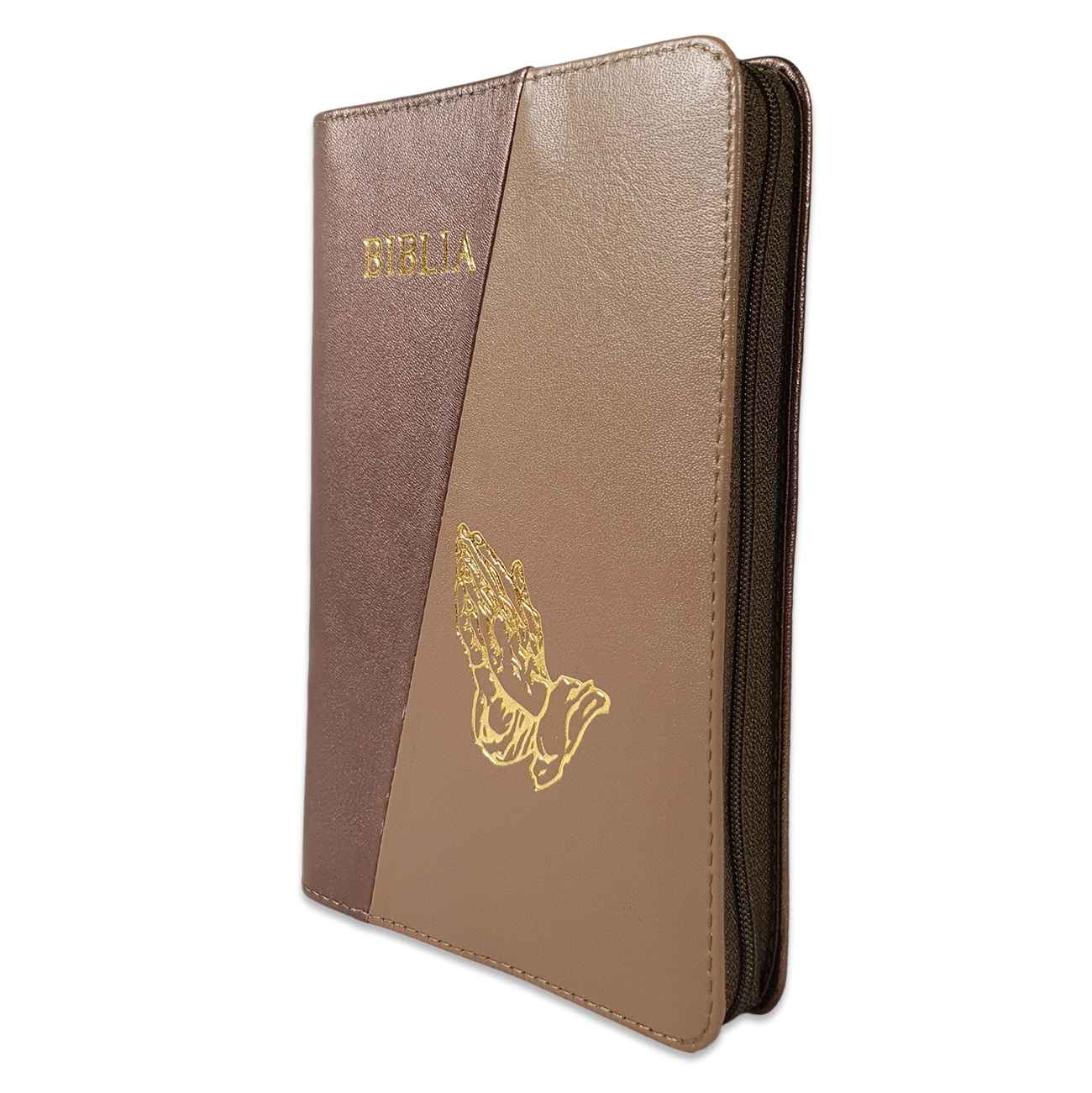 Biblie din piele, marime medie, culoare maro sidefat cu cafeniu, simbol maini in rugaciune, fermoar, index, margini aurii, cuv. lui Isus cu rosu [SB 057 PFI]