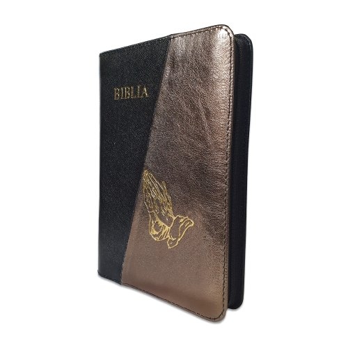 Biblie din piele, marime medie, culoare negru cu bronz sidefat, fermoar, maini in rugaciune, margini albe,cuv. lui Isus cu rosu [053]