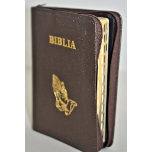 Biblie din piele, marime medie, culoare maro sidefat, simbol maini in rugaciune, fermoar, index, margini aurii, [SB 057 PFI]