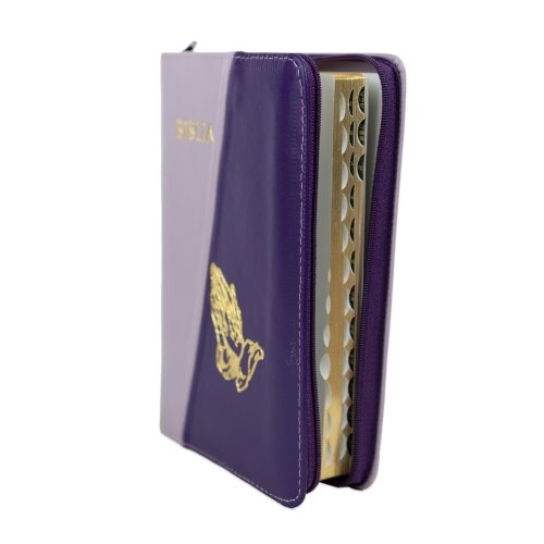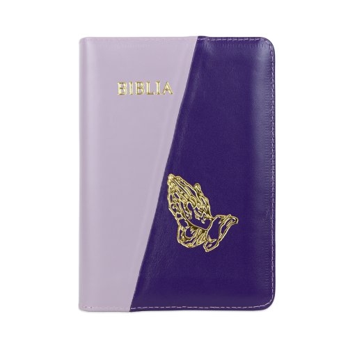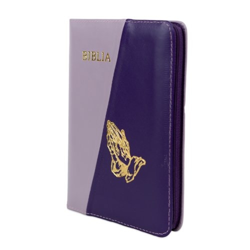 Biblie din piele, marime medie, culoare, mov deschis cu mov închis, simbol maini in rugaciune, fermoar, index, margini aurii, cuv. lui Isus cu rosu [SB 057 PFI]