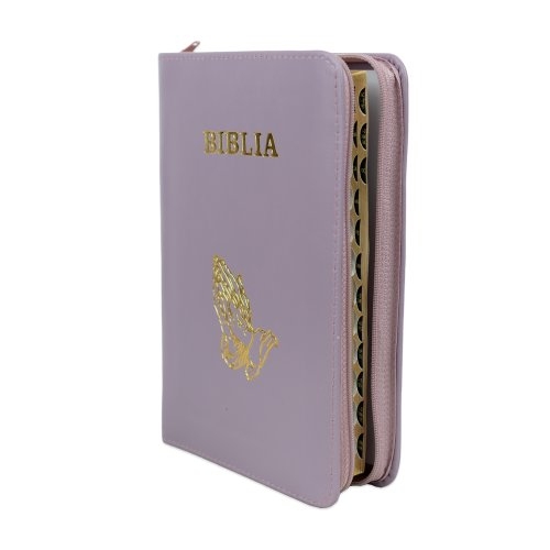 Biblie din piele, marime medie, culoare, mov deschis, simbol maini in rugaciune, fermoar, index, margini aurii, cuv. lui Isus cu rosu [SB 057 PFI]