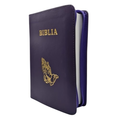 Biblie din piele, marime medie, culoare, mov, fermoar, margini albe, simbol maini in rugaciune, cuv. lui Isus cu rosu [053]