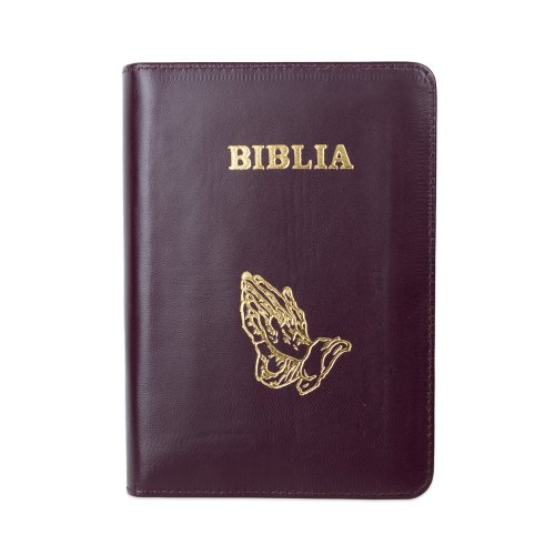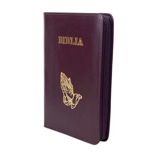 Biblie din piele, marime medie, culoare, mov închis, fermoar, margini albe, simbol maini in rugaciune, cuv. lui Isus cu rosu [053]