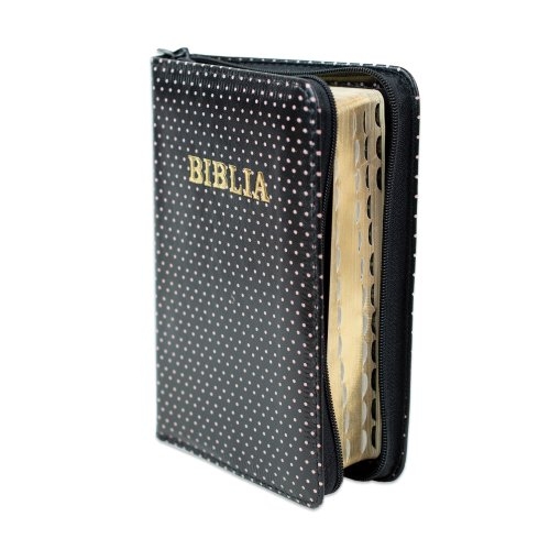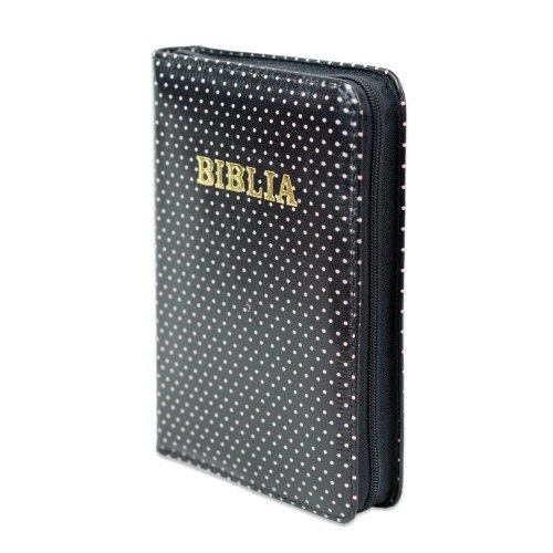 Biblie din piele, marime medie, culoare neagra cu puncte roz , fermoar, index, margini aurii, harti biblice [SI 057 PFI]