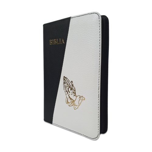 Biblie din piele, marime medie, culoare negru cu alb, fermoar, maini in rugaciune, margini albe,cuv. lui Isus cu rosu [053]