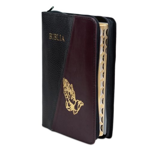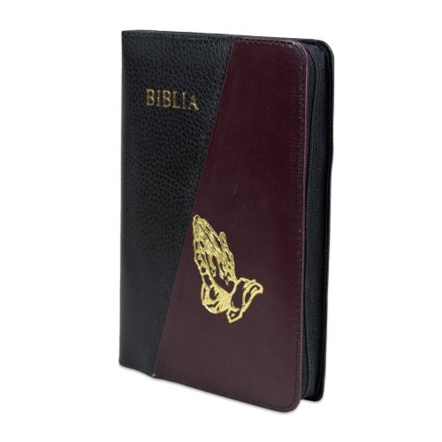 Biblie din piele, marime medie, culoare negru cu bordo, simbol maini in rugaciune, fermoar, index, margini aurii, cuv. lui Isus cu rosu [SB 057 PFI]