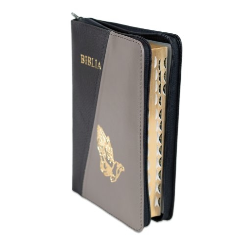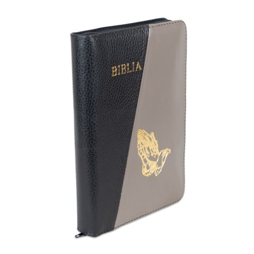 Biblie din piele, marime medie, culoare negru cu gri, simbol maini in rugaciune, fermoar, index, margini aurii, cuv. lui Isus cu rosu [SB 057 PFI]