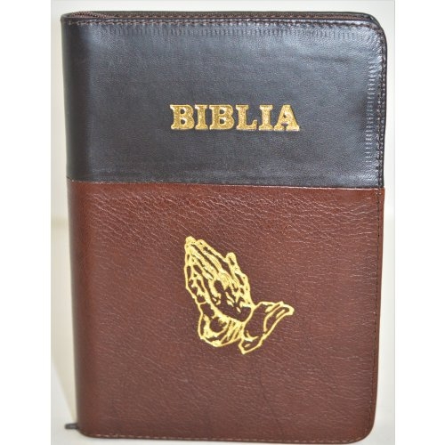 Biblie din piele, marime medie, culoare negru cu maro, simbol maini in rugaciune, fermoar, index, margini aurii, [SB 057 PFI]