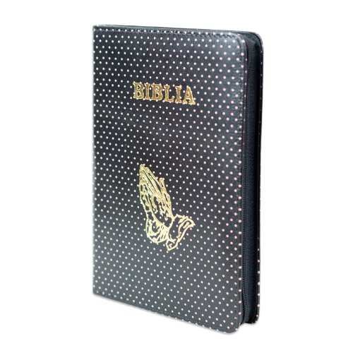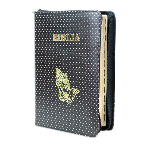 Biblie din piele, marime medie, culoare negru cu puncte roz, maini in rugaciune, fermoar, index, margini aurii, harti biblice [SI 057 PFI]