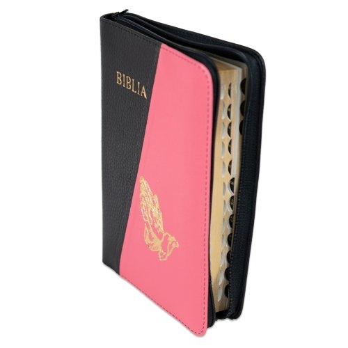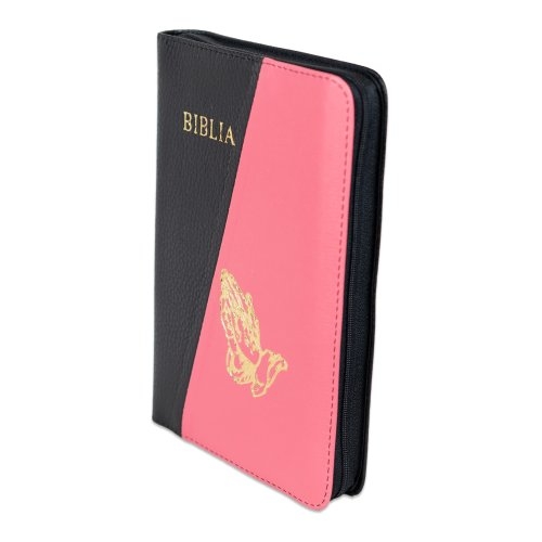 Biblie din piele, marime medie, culoare negru cu roz coral, simbol maini in rugaciune, fermoar, index, margini aurii, cuv. lui Isus cu rosu [SB 057 PFI]