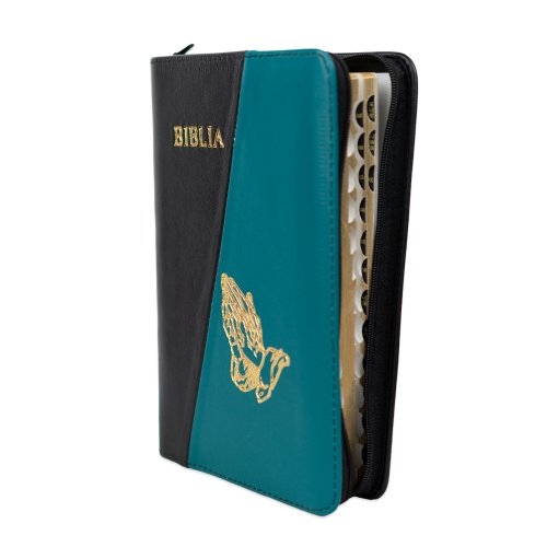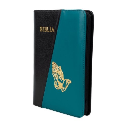 Biblie din piele, marime medie, culoare, negru cu turcoaz, simbol maini in rugaciune, fermoar, index, margini aurii, cuv. lui Isus cu rosu [SB 057 PFI]