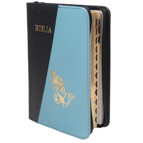 Biblie din piele, marime medie, culoare negru cu turcoaz, simbol maini in rugaciune, fermoar, index, margini aurii, cuv. lui Isus cu rosu [SB 057 PFI]