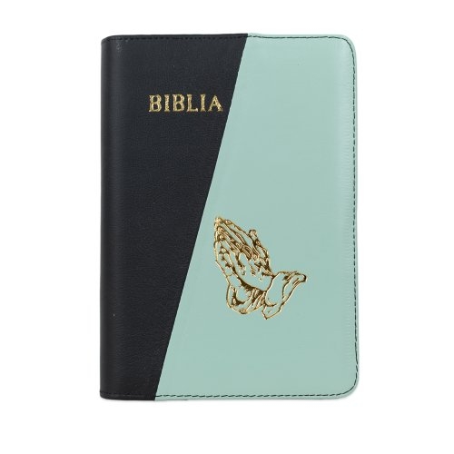 Biblie din piele, marime medie, culoare, negru cu verde mentă, simbol maini in rugaciune, fermoar, index, margini aurii, cuv. lui Isus cu rosu [SB 057 PFI]