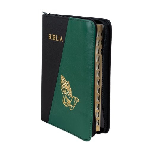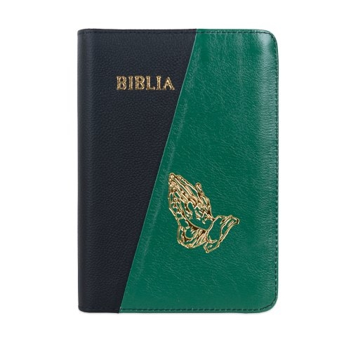 Biblie din piele, marime medie, culoare, negru cu verde, simbol maini in rugaciune, fermoar, index, margini aurii, cuv. lui Isus cu rosu [SB 057 PFI]