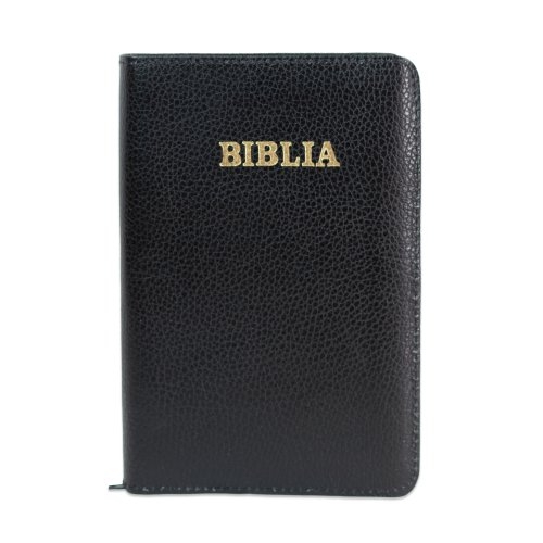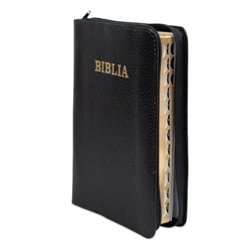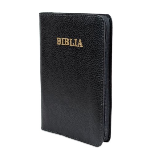 Biblie din piele, marime medie, culoare negru texturat, fermoar, index, margini aurii, cuv. lui Isus cu rosu [SB 057 PFI]