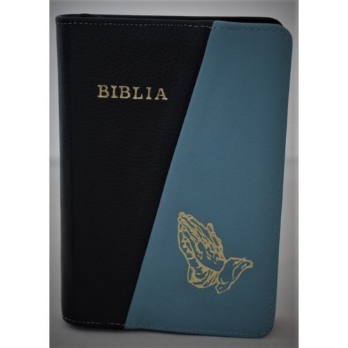 Biblie din piele, marime medie, culoare negru-turcuaz, simbol maini in rugaciune, fermoar, index, margini aurii, cuv. lui Isus cu rosu [SB 057 PFI]